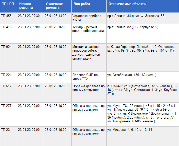 График отключения электричества, список улиц и вид проводимых работ указаны в таблице ниже: