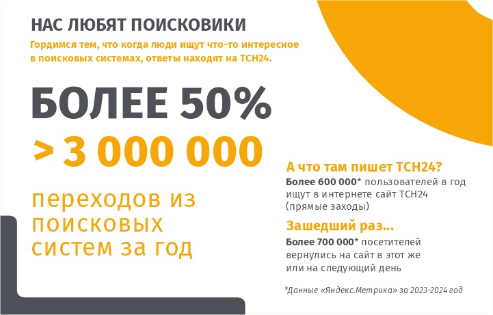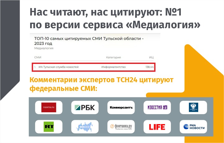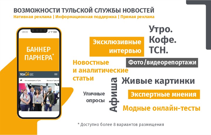 ИА «Тульская Служба Новостей – ТСН24.РУ» – одно из ведущих интернет-изданий региона, которое возглавляет список СМИ Тульской области по цитируемости и размеру аудитории. Мы готовы к долгосрочному и взаимовыгодному сотрудничеству с вами.