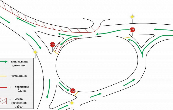 Для обеспечения безопасности дорожного движения изменена очередность проезда на круговом движении: оно временно будет второстепенным относительно примыкающих участков. Также на участке установлены знаки 2.5 «Движение без остановки запрещено».