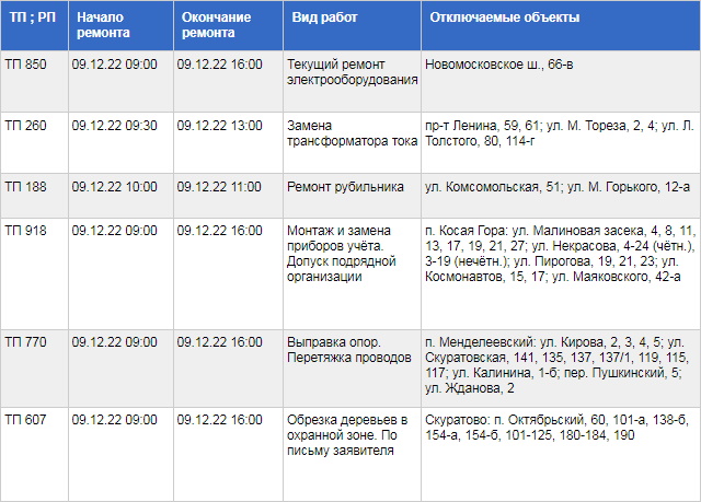 - Часть Тулы останется без электричества 8 декабря из-за плановых работ;