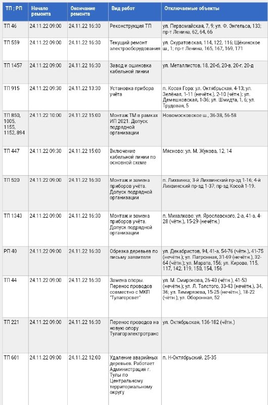 С полным списком адресов, где 24 ноября не будет электроэнергии, а также с видами выполняемых работ, можно ознакомиться в таблице, приведенной ниже.