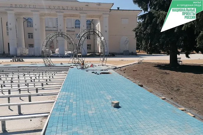 В Алексине продолжают работы по благоустройству городской площади у ДК им. В.С. Бондаря. Специалисты устанавливают навесы и беседки, проводят укладку плиточного покрытия и формируют пеший маршрут «Река времени».