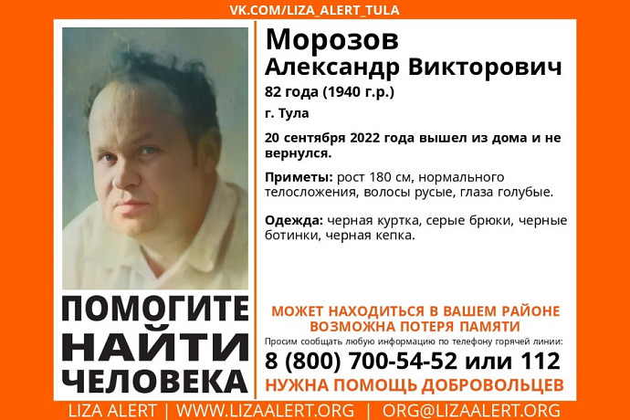 В Туле начался поиск пропавшего 20 сентября 82-летнего пенсионера Морозова Александра Викторовича, сообщают волонтеры из отряда «Лиза Алерт». Возможна потеря памяти.