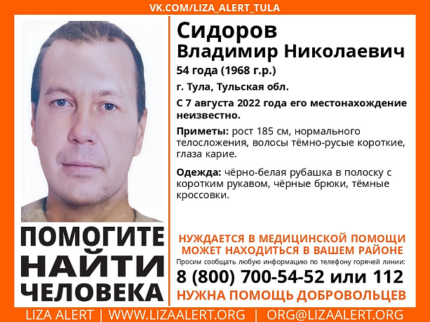 Информация об этом поступила от поисковиков из отряда «ЛизаАлерт» по Тульской области. Владимир был одет в черно-белую рубашку в полоску с коротким рукавом, черные брюки и темные кроссовки. Из примет — рост 185 сантиметров, нормального телосложения, волосы темно-русые, короткие, глаза карие.