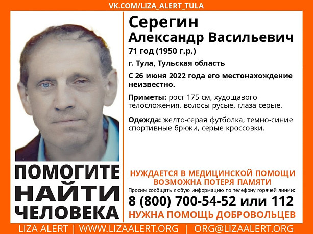 В Туле пропал 71-летний мужчина Серегин Александр Васильевич. Его местонахождение неизвестно с 26 июня 2022 года.