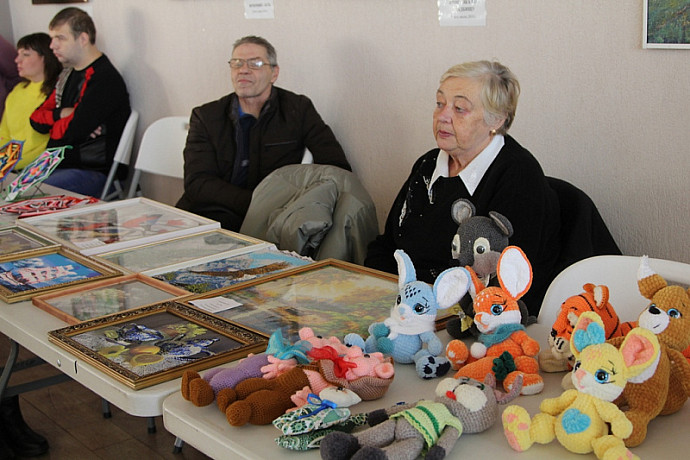 В рамках мероприятия в фойе Городского концертного зала открылась выставка творчества членов общества инвалидов. Там были презентованы иконы из бисера, картины из бумаги в технике оригами, гобелены, тряпичные и глиняные игрушки, вязаные вещи и другие предметы рукоделия.