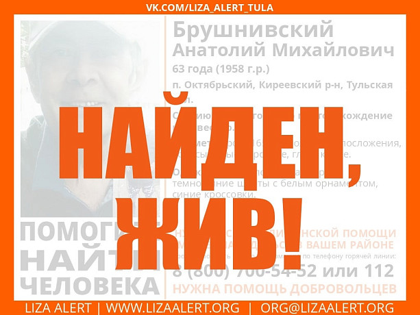 В Тульской области нашли живым 63-летнего Брушниковского Анатолия, пропавшего в Киреевском районе. Его местонахождение было неизвестно с 29 июня 2022 года.