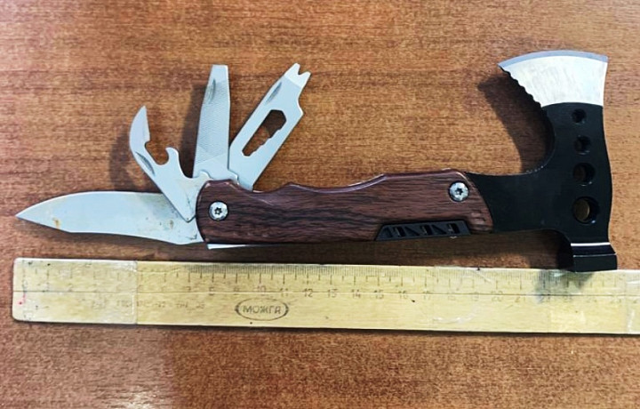 Однако при осмотре рюкзака, принадлежащего мужчине, сотрудники органов принудительного исполнения обнаружили в нем раскладной универсальный нож с топориком.